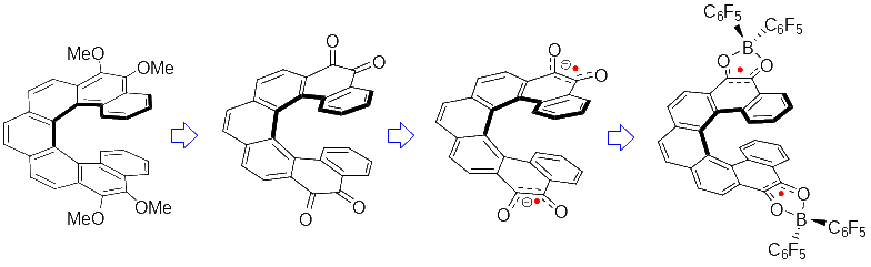凯发k8上海有机化学研究所研究员王新平团队设计并合成了新型手性螺烯双自由基化合物。该团队设计并合成了由邻二醌官能团化的[7]螺烯分子Rac-3及其对映异构体P/M-3。研究对Rac/P/M-3进行化学还原,分离出稳定的双阴离子及其对映异构体(Rac/P/M-3K)。在此基础上,与B(C6F5)2Cl反应,研究获得中性含硼螺烯双自由基Rac/P/M-3B。进而,研究对化合物Rac/P/M-3K和Rac-3B进行单晶、EPR、SQUID及紫外吸收光谱等表征。EPR和SQUID测试结果表明,3K和3B的基态均为开壳层单线a态双自由基。这一结果与理论计算结果吻合。