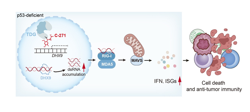 研究发现,TDG是p53缺失肿瘤中的新型合成致死靶点,敲除TDG可抑制p53缺失肿瘤细胞的增殖,而对p53野生型的肿瘤细胞没有任何影响。该现象在KrasG12D驱动的小鼠肺腺癌模型以及多种人肿瘤细胞系中均获验证。机制上,TDG与p53功能互补,共同激活RNA解旋酶DHX9的转录;p53缺失时,TDG增强DHX9激活以弥补功能,抑制TDG则导致DHX9下调、异常dsRNA积累,激活RIG-I/MDA5–MAVS通路,从而抑制肿瘤并增强免疫。