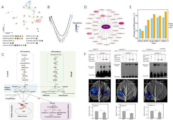 凯发k8西双版纳热带植物园及其合作者,构建了续随子幼嫩叶和成熟叶的单细胞核转录组图谱,鉴定出乳管细胞类型。研究发现,MVA途径相关基因在续随子乳管中显著富集,与三萜合成酶LAS、BUT、CAS及橡胶合成相关基因CPT、CBP、SRPP呈现共表达特征。结合超微结构观察和化学分析,发现续随子乳白色汁液中含有小橡胶粒子,并能产生微量、低分子量天然橡胶,证实续随子具有天然橡胶合成能力。基因组比较分析表明,续随子橡胶合成相关基因家族成员相对较少,且缺乏Hevea-like REF延长因子,可能限制橡胶积累与分子量形成。共表达网络分析与基因功能研究显示,乳管特异性DOF转录因子ElCOG1负调控橡胶合成酶ElCPT1和三萜合成酶ElBUT1,提示其可能参与乳管中橡胶与萜类代谢调控。